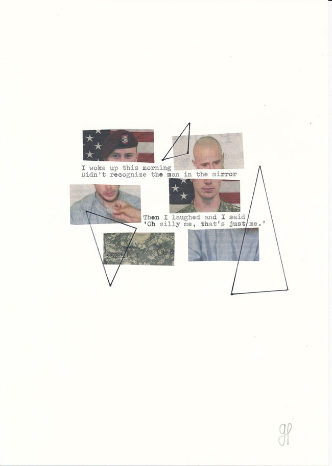 Photographs of famous people cut in to strips. Song lyrics from the typewriter, which tell the story. Triangles drawn with marker and geo triangle to accentuate the greatness of Kubism.